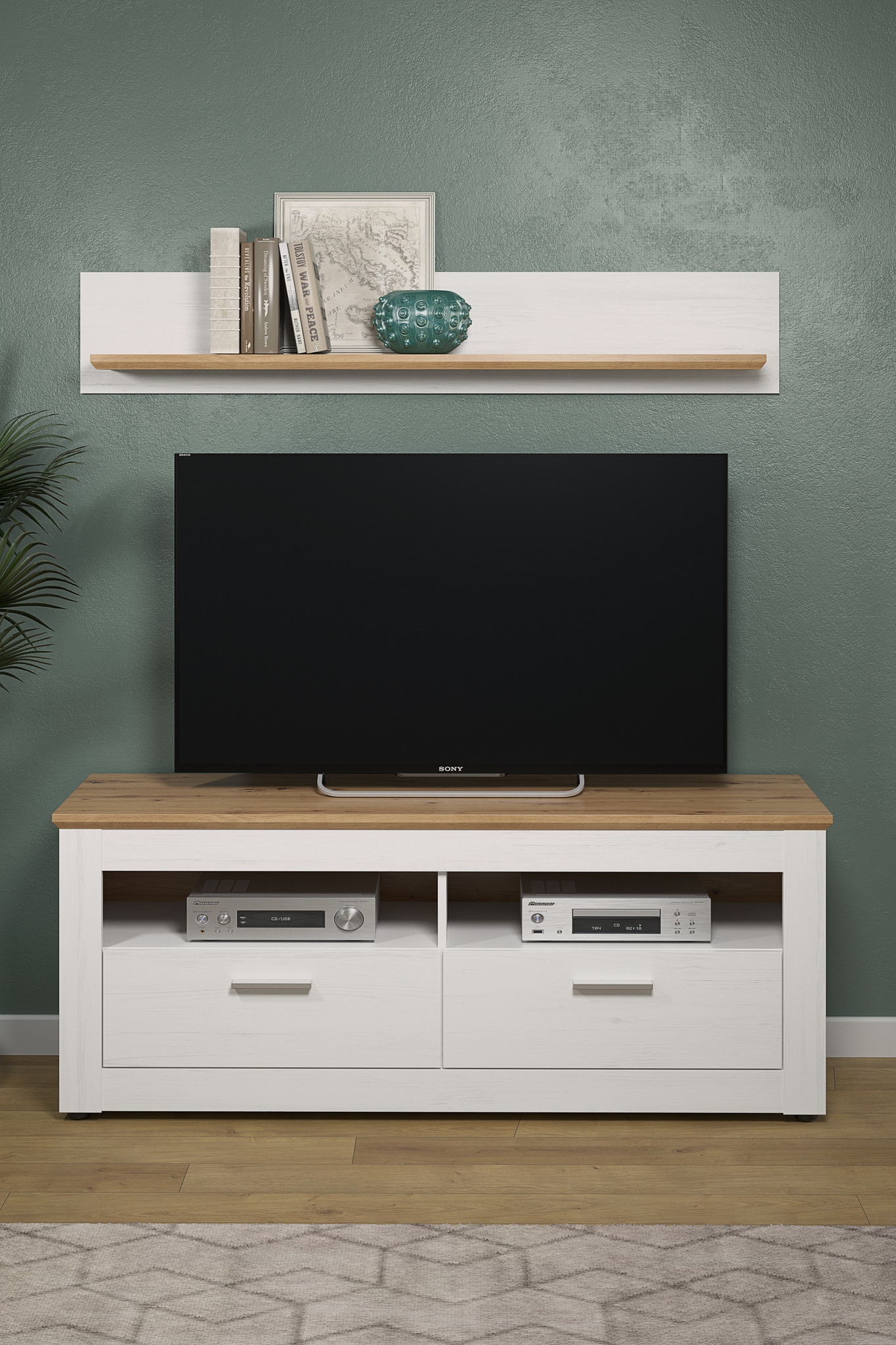 Shade TV-meubel 2 lades, 2 open vakken wit dennenhout decor, eiken decor.