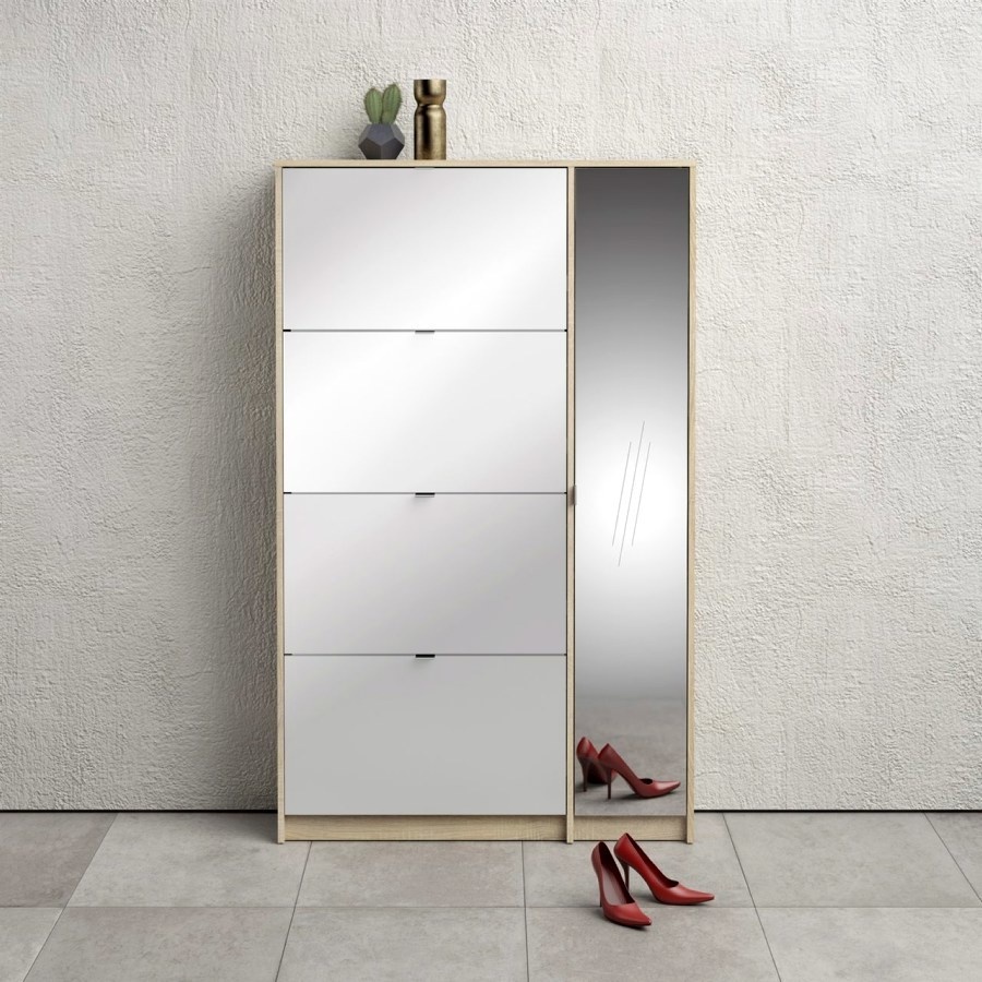 Shane schoenenkast 4 klapdeuren 2R, 1 spiegeldeur eikenstructuur decor, wit hoogglans.