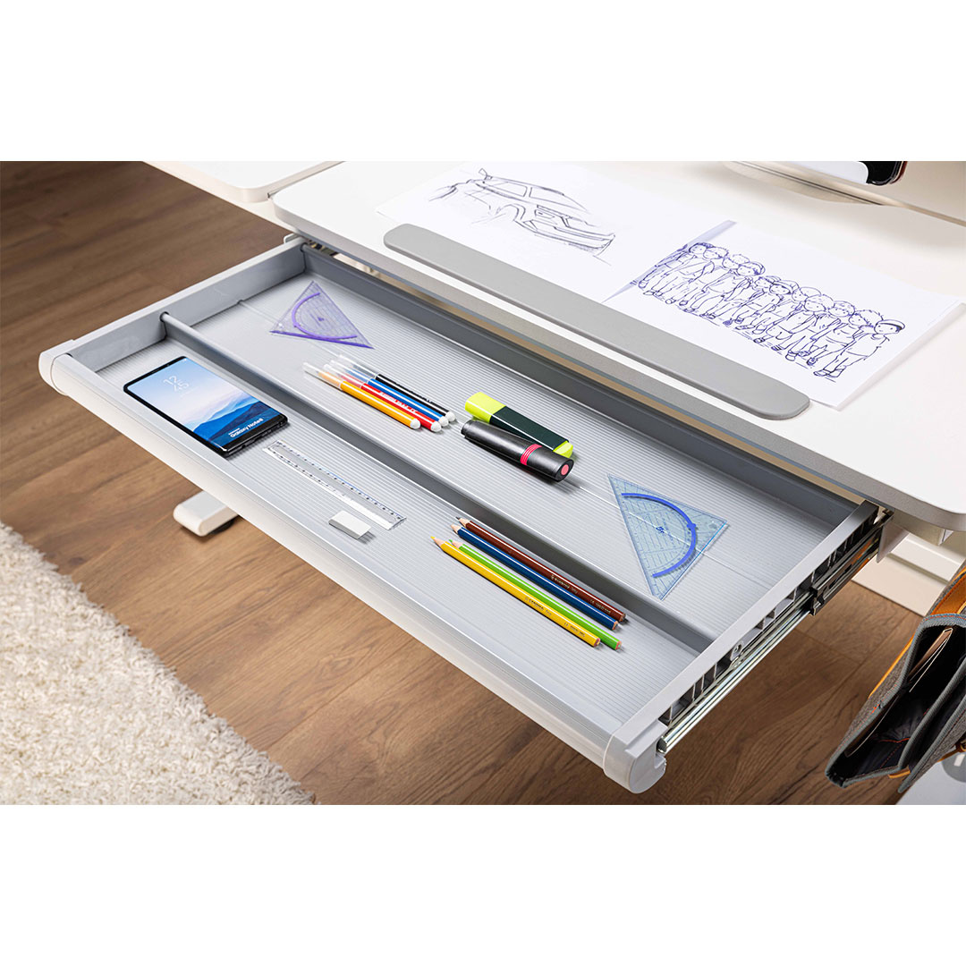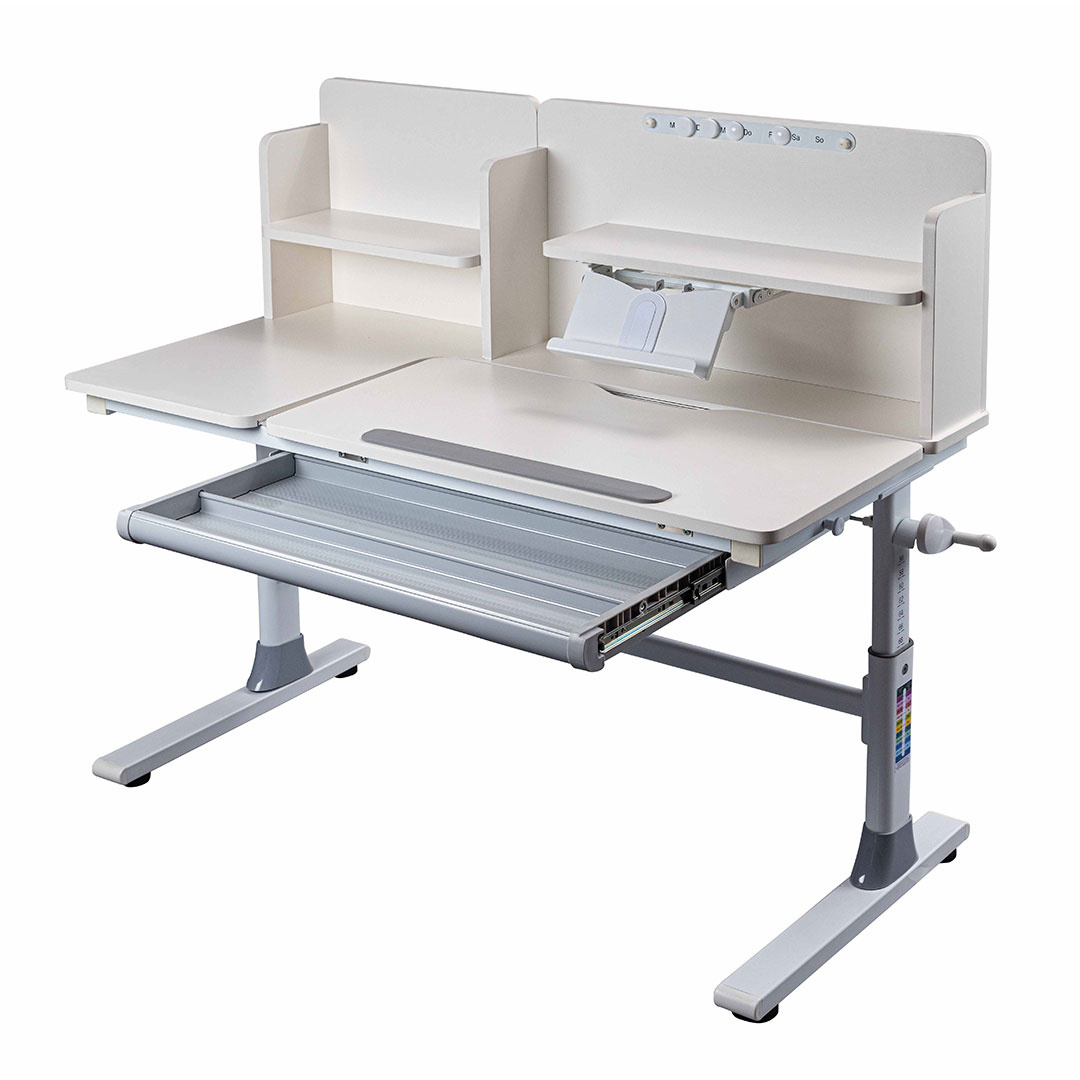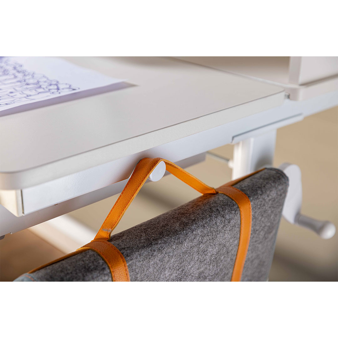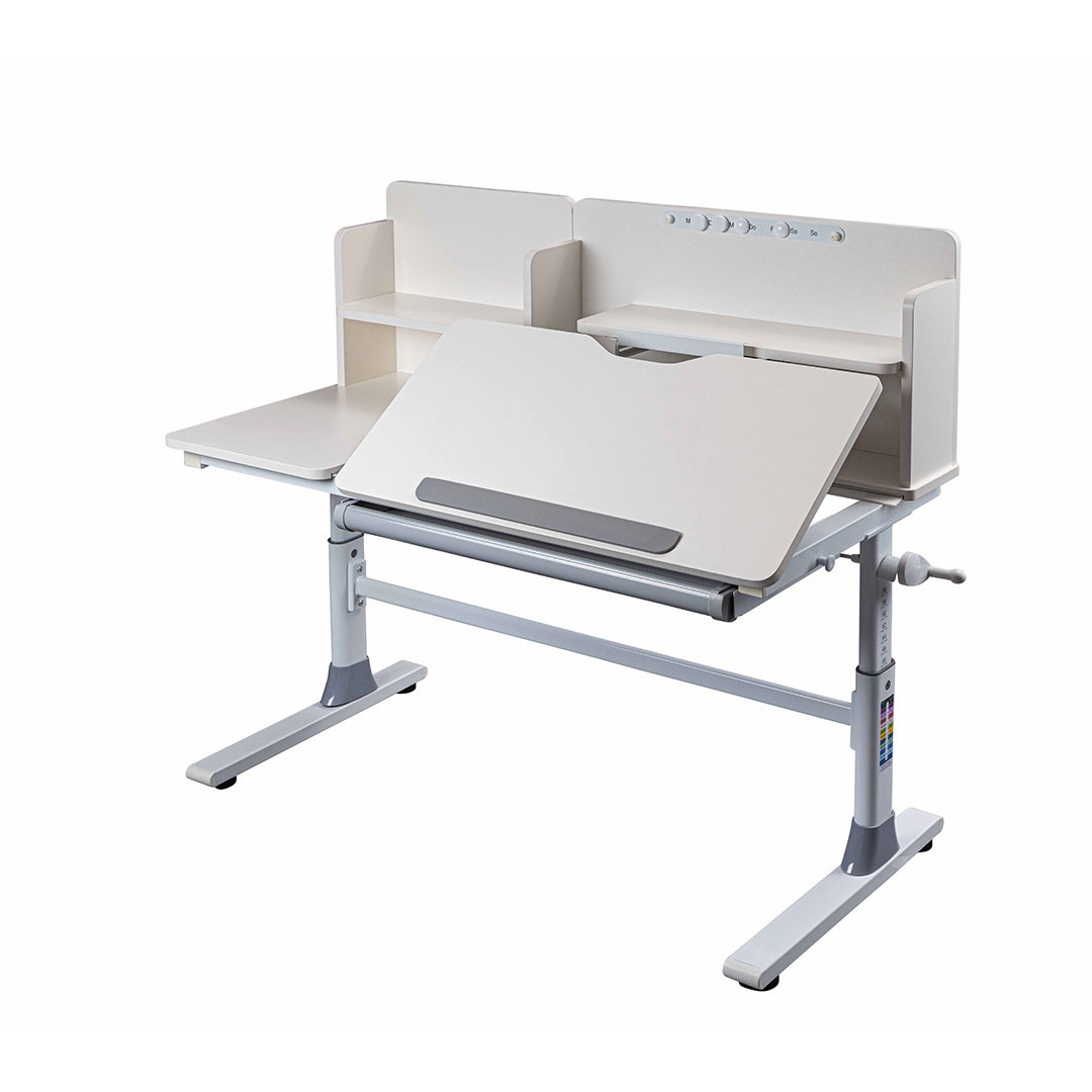 Sören bureau verstelbaar wit, grijs. Met planken. Met magneten. Kindveilige afneembare slinger. Haken. Het Sören bureau is een veelzijdige en functionele oplossing voor de kinderkamer of de creatieve werkruimte. De tafel is voorzien van hoogteverstelling en een verstelbaar tafelblad, waardoor deze aan te passen is aan de groei en behoeften van het kind. De geïntegreerde planken bieden voldoende opbergruimte voor boeken en materialen, terwijl de magneten op het achterpaneel een leuke en praktische manier bieden om notities of foto's te ordenen. De kindveilige afneembare slinger maakt hoogteverstelling eenvoudig en veilig. Met haken voor tassen of accessoires combineert het Sören bureau functionaliteit en design op de beste manier. Door de klassieke combinatie van wit en grijs past hij gemakkelijk in elk interieur.