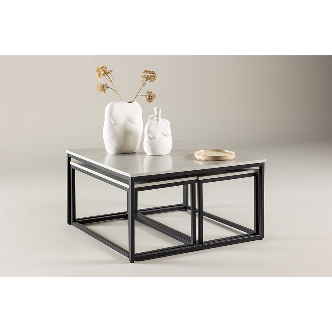 Solna salontafelset met 3 grijs is een salontafel in de kleur grijs, die zowel stijl als functionaliteit in uw huis brengt. Solna salontafel set van 3 grijs. De Solna salontafel is een smaakvol ontworpen meubelstuk dat functionaliteit combineert met Scandinavische elegantie. De indrukwekkende Solna salontafel wordt geleverd met twee kleinere salontafels die gemakkelijk onder de grote salontafel kunnen worden geschoven wanneer ze niet worden gebruikt. Met de afmetingen 80x80 cm voor de grote tafel en 73x38 cm voor de kleinere tafels biedt Solna een flexibele oplossing die past bij zowel kleine als grote ruimtes. De tafelbladen in grijs MDF en de poten in zwart staal zorgen voor een mooi contrast en creëren een moderne uitstraling en stijlvol ontwerp. Het doordachte ontwerp van de Solna salontafel combineert Scandinavische eenvoud met functionaliteit. Het is niet alleen een functioneel meubelstuk, maar ook een indrukwekkend interieurdetail dat uw woonkamer een moderne en stijlvolle sfeer geeft. Of het nu wordt gebruikt om decoratieve voorwerpen tentoon te stellen of om hapjes en drankjes te serveren tijdens gezellige bijeenkomsten, Solna zal uw dagelijks leven betoveren met zijn Scandinavische charme en elegantie. Dit product is gemaakt met oog voor detail, wat zowel esthetische aantrekkingskracht als hoge duurzaamheid garandeert. Het is ontworpen met zowel functionaliteit als stijl in gedachten, waardoor het de perfecte keuze is voor elke kamer in uw huis. De gebruikte materialen zijn van hoge kwaliteit, waardoor het product een lange levensduur heeft en bestand is tegen dagelijks gebruik. Of het nu voor opslag is of als decoratieve toevoeging, dit product zal uw interieur naar een hoger niveau tillen en extra comfort en elegantie in uw huis brengen.