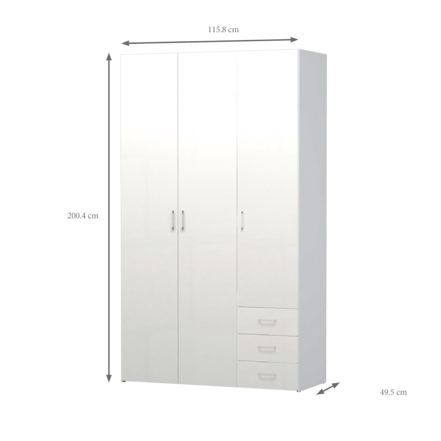 Spell kledingkast 3 deuren en 3 lades wit hoogglans.