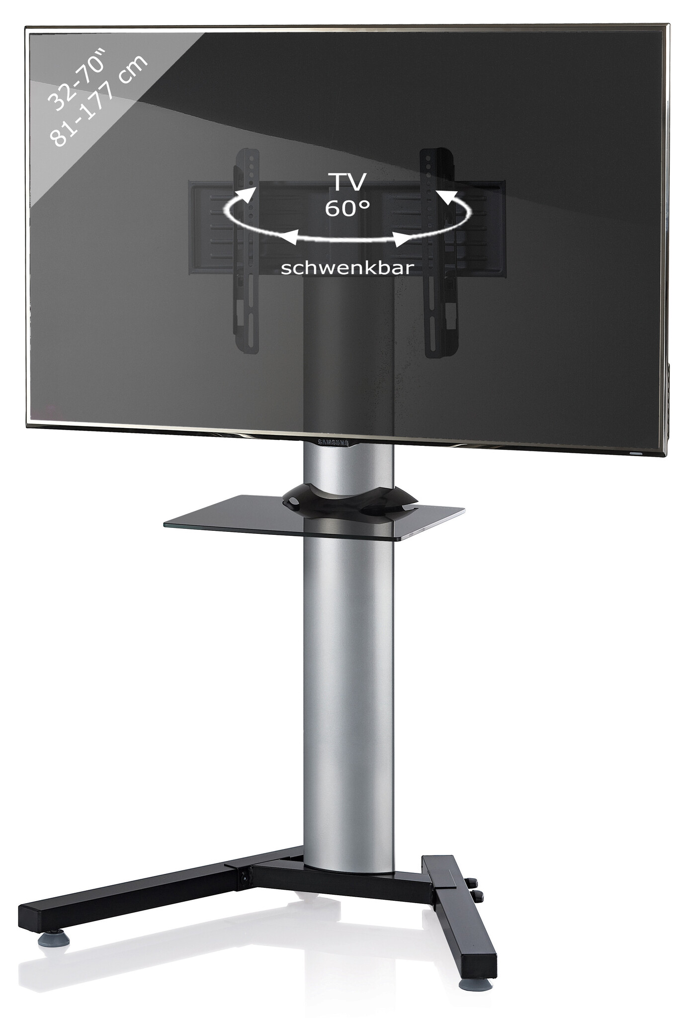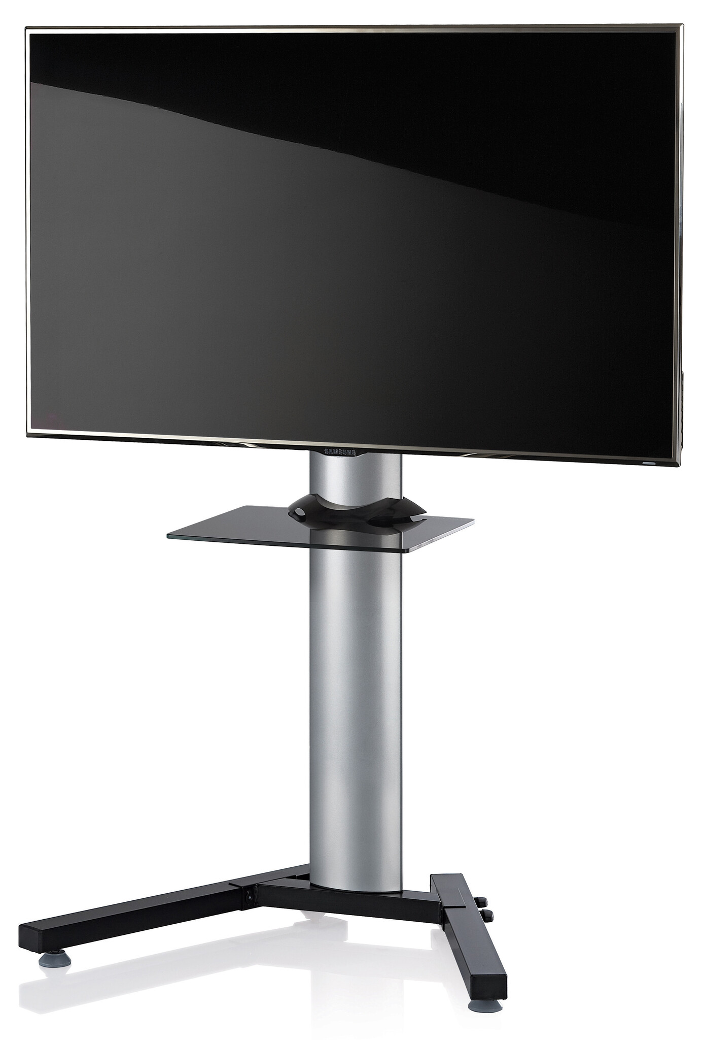 StadinoMini TV-meubel met V-voet en 1 glazen legger, Zilverkleurig, zwart glas. Stalen onderstel met zwart glazen blad, aluminium standbuis.
