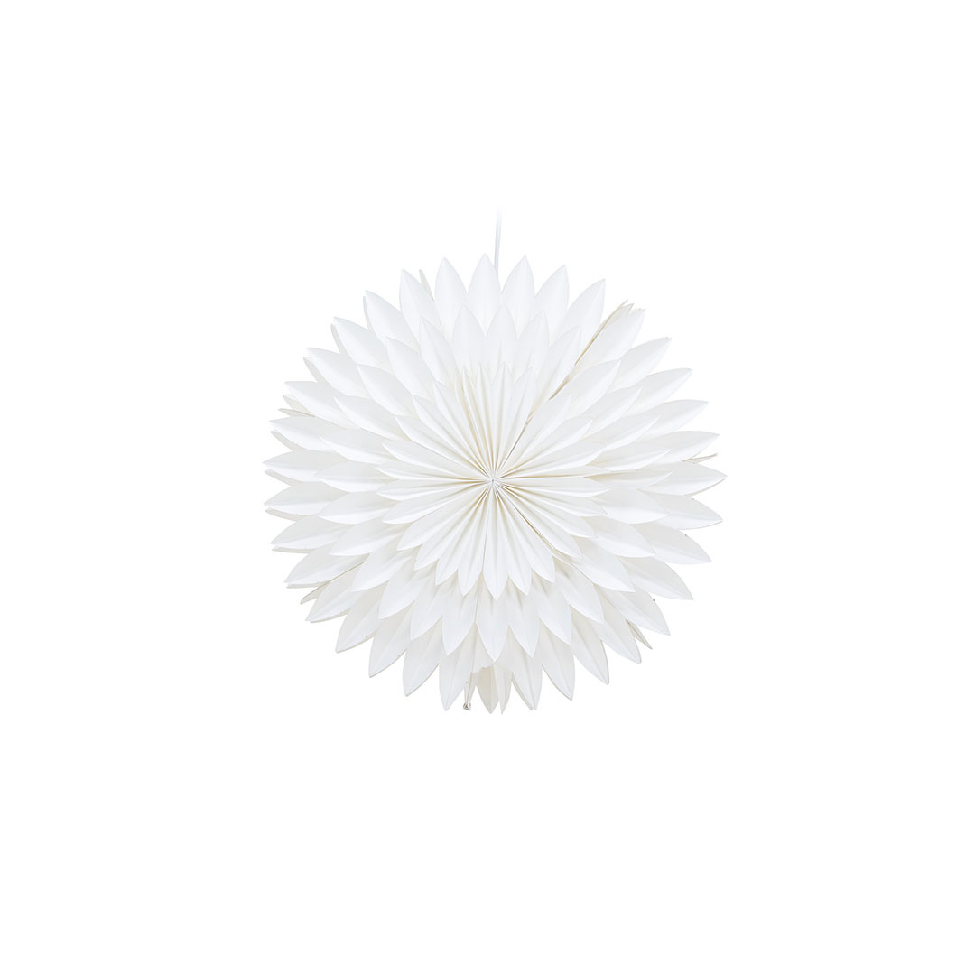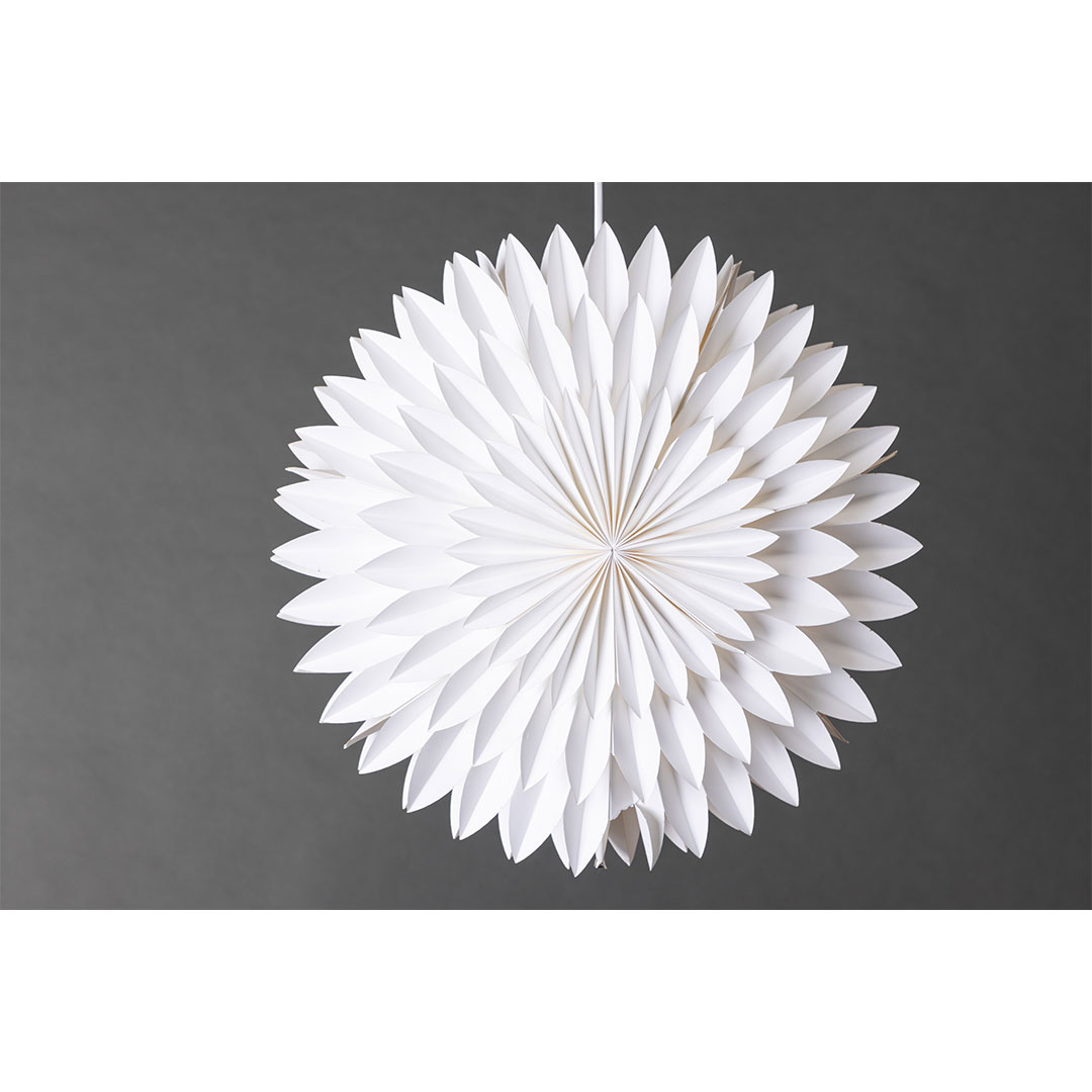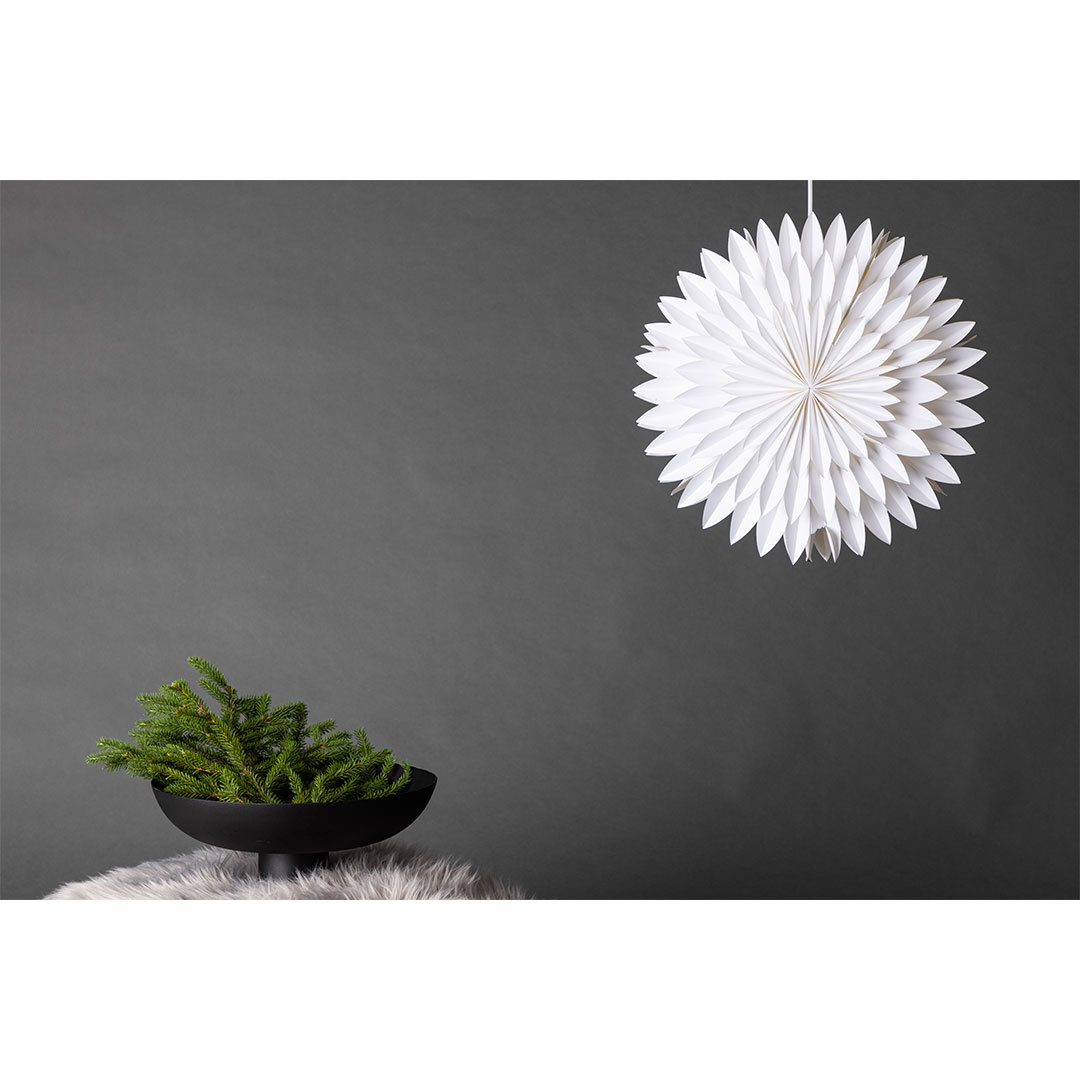 Grote kerstster met licht papier Ø46cm hanglamp wit is een kerstlamp in witte kleur die zowel stijl als functionaliteit in uw huis brengt. Grote kerstster met licht papier Ø46cm hanger wit. Lichtbron: E14. Watt (W): 15. Excl. Gloeilamp. Incl. draad. Storlien - een witte papieren ster in meerdere lagen die voor een gezellige sfeer in huis zorgt! Of het nu tijdens de mysterieuze herfstavonden is of tijdens de kerstfestiviteiten, de plafondlamp uit de serie Storlien verspreidt een warme en uitnodigende gloed die uw kamer in één klap in een oase van rust verandert. Deze witte plafondlamp is verkrijgbaar in verschillende maten, zodat je degene kunt kiezen die perfect bij jouw kamer past. Hang hem in het keukenraam, de slaapkamer of bij de bank om het charmante licht te verspreiden waar je op donkere dagen naar verlangt. Dankzij de papierlaag van de lamp ontstaat er bovendien een prachtig gevoel van dynamiek en krijgt de lamp een heel andere diepte met meer dimensies. Plaats hem waar hij de meeste liefde en waardering krijgt, en geniet van je favoriete bezigheden zoals lezen en handwerken onder de aangename gloed van een feestelijke plafondlamp die snel in het oog springt! Afmetingen: 46 cm. Dit product is gemaakt met oog voor detail, wat zowel esthetische aantrekkingskracht als hoge duurzaamheid garandeert. Het is ontworpen met zowel functionaliteit als stijl in gedachten, waardoor het de perfecte keuze is voor elke kamer in uw huis. De gebruikte materialen zijn van hoge kwaliteit, waardoor het product een lange levensduur heeft en bestand is tegen dagelijks gebruik. Of het nu voor opslag is of als decoratieve toevoeging, dit product zal uw interieur naar een hoger niveau tillen en extra comfort en elegantie in uw huis brengen.