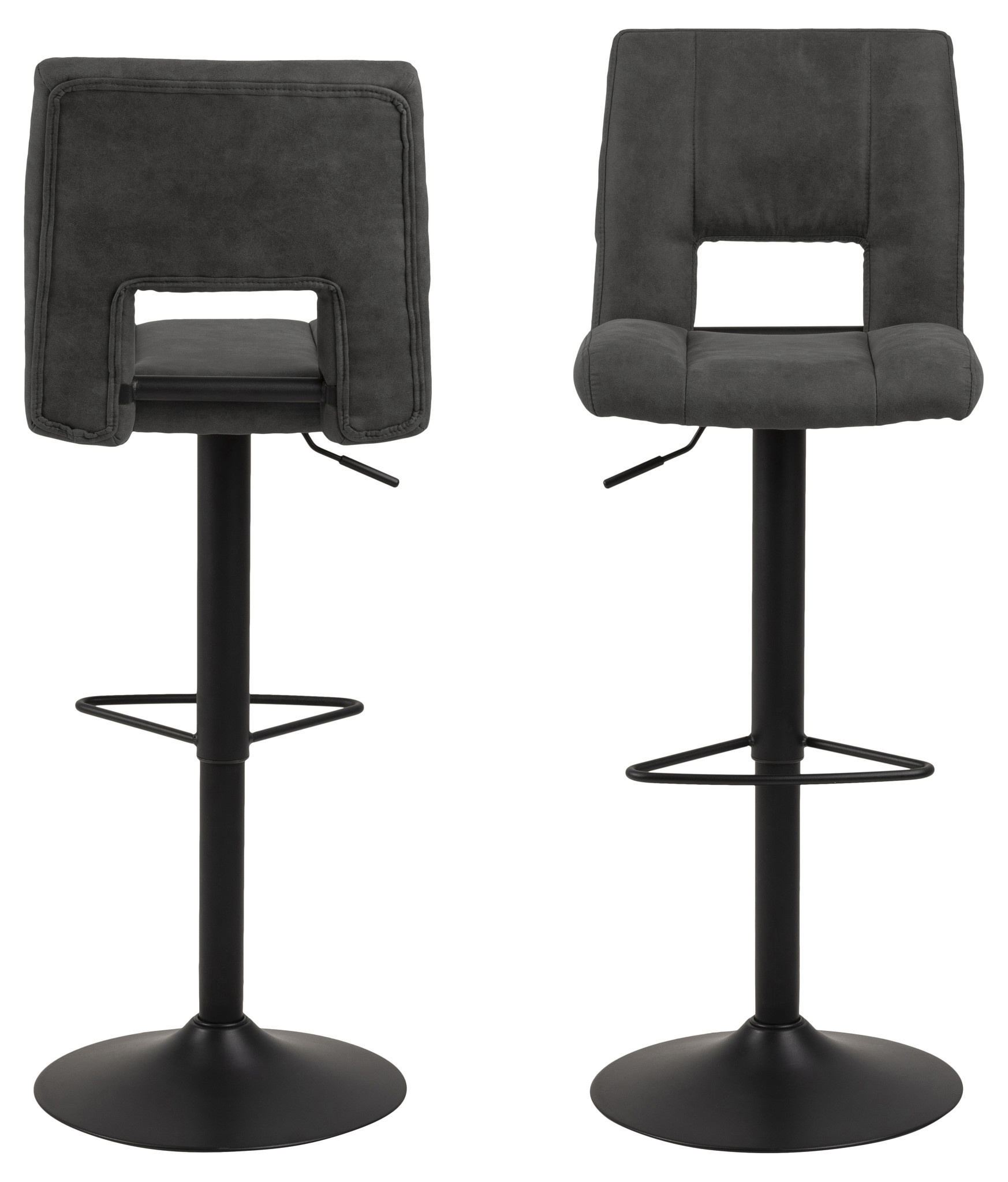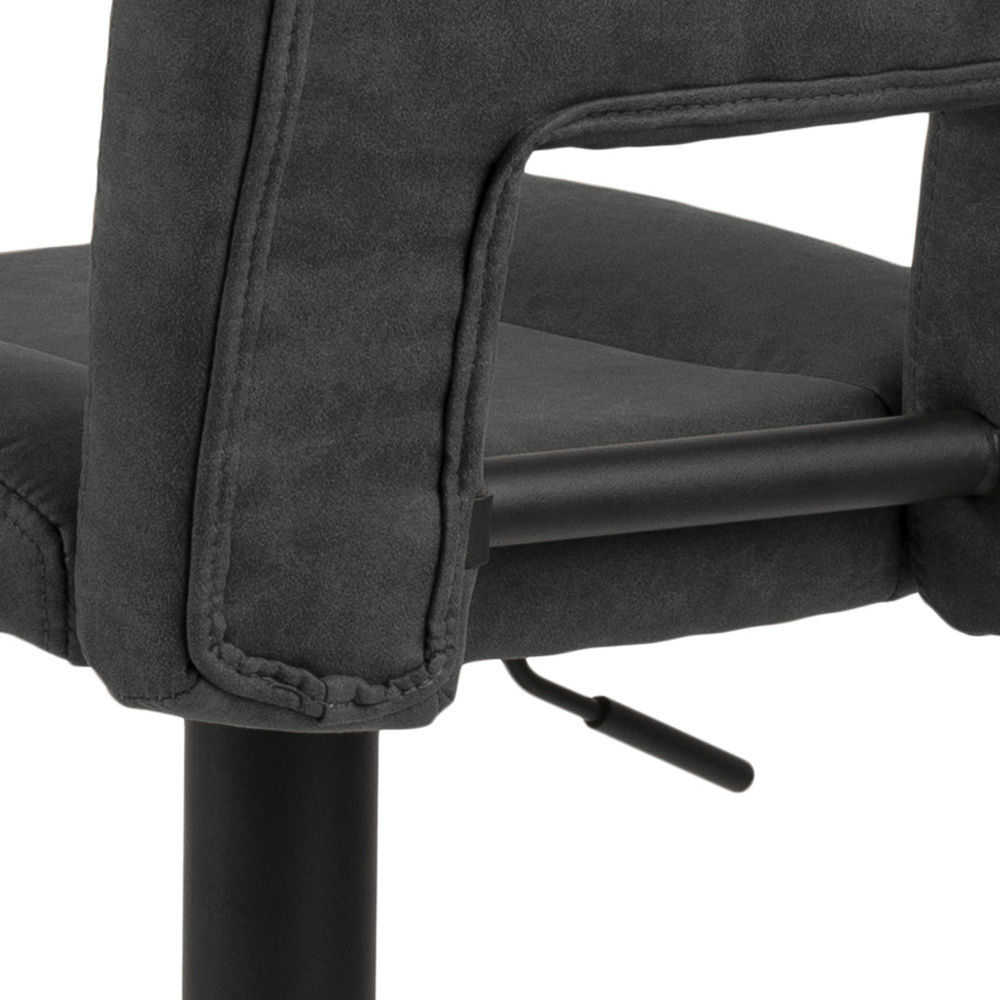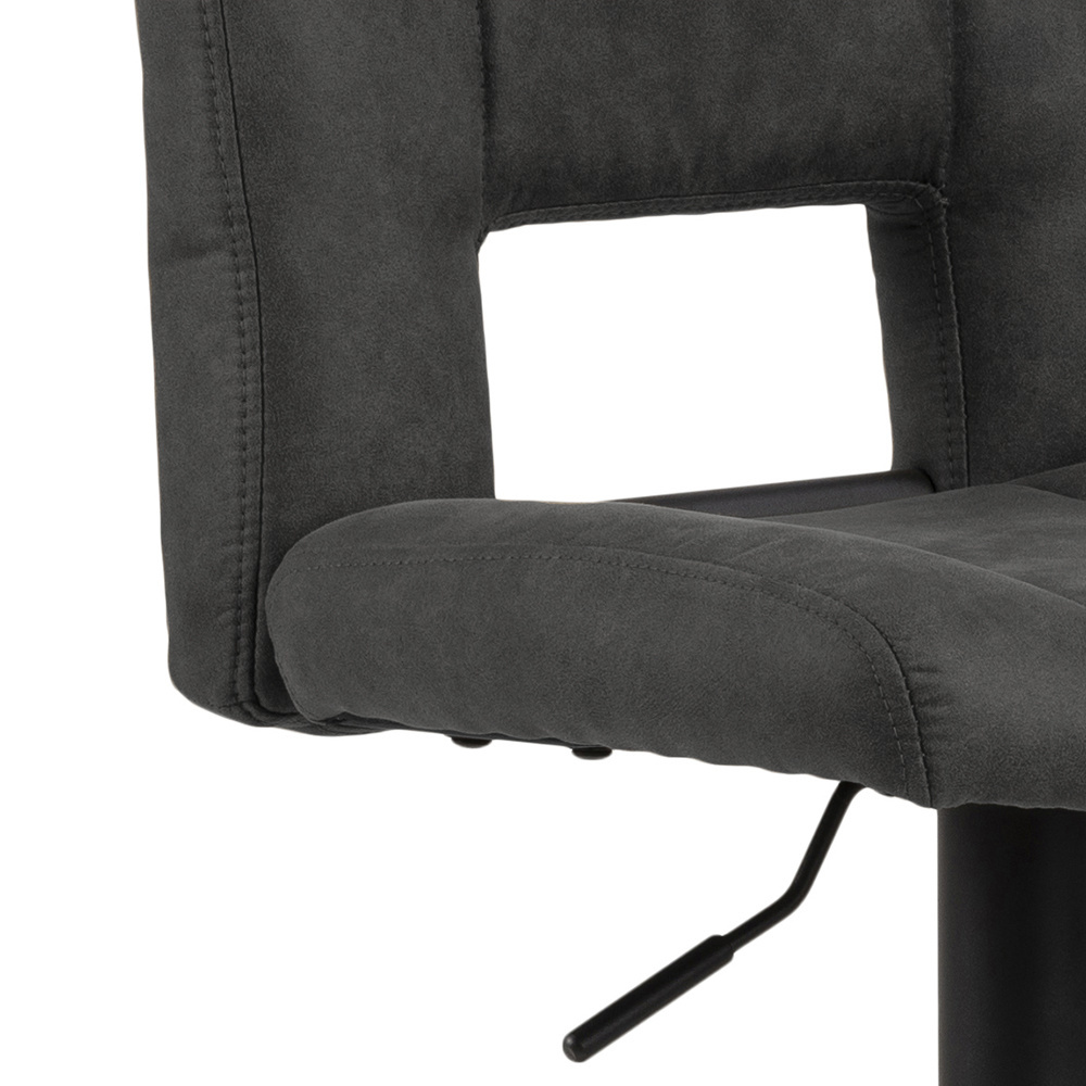 Materiaal: Preston stof antraciet 96, gasveer TÜV, voetensteun, trompetvoet ruw gepoedercoat, mat zwart.