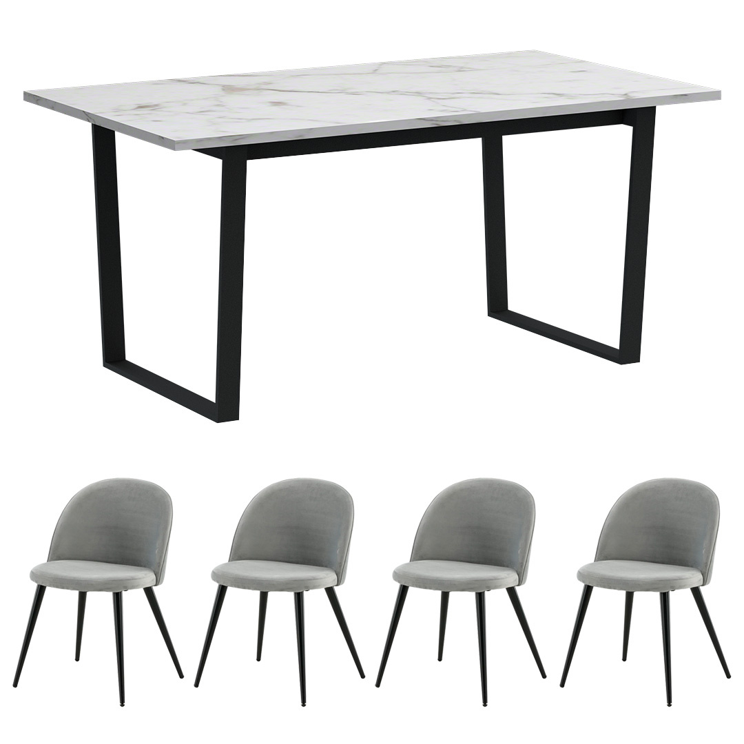 ebuy24 Tilst eethoek eettafel wit marmerprint 90x160 4 stoelen velours grijs.