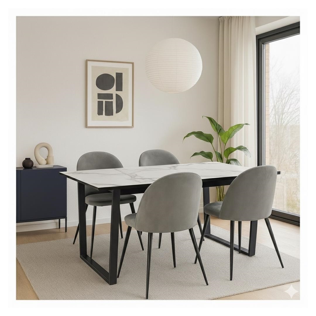 De Tilst eettafelset combineert moderne elegantie met tijdloze luxe. Deze stijlvolle set bestaat uit een tafel met marmerprint en vier velours stoelen die samen een exclusieve sfeer creëren in je eetkamer.De tafel is 90 cm breed en 160 cm lang, wat voldoende ruimte biedt voor zowel de dagelijkse maaltijden als gezellige diners met gasten. Het tafelblad heeft een mooie marmerprint die een luxe gevoel geeft, terwijl het stevige frame en de stijlvolle poten in zwart metaal zorgen voor zowel stabiliteit als een moderne uitstraling. Met een hoogte van 74 cm past de tafel perfect bij de elegante stoelen.De stoelen zijn bekleed met zacht velours en ontworpen met het oog op comfort. Ze zijn 50 cm breed, 57 cm diep en 76,5 cm hoog, met een zithoogte van 47 cm en een zitdiepte van 43 cm. De gebogen rugleuning en de gewatteerde zitting zorgen voor een comfortabele zitervaring, perfect voor lange gesprekken rond de tafel.Deze eettafelset is ideaal voor wie functionaliteit wil combineren met luxueus design en een verfijnde look in huis wil creëren.
