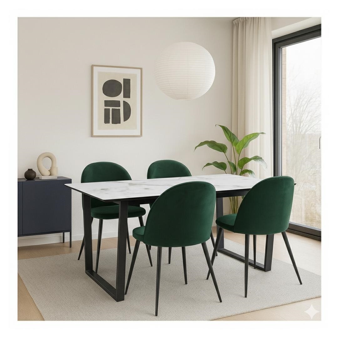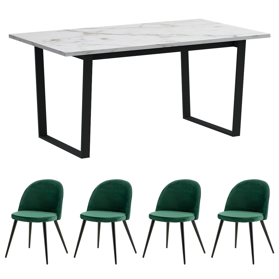 ebuy24 Tilst eethoek eettafel wit marmerprint 90x160 4 stoelen velours groen.