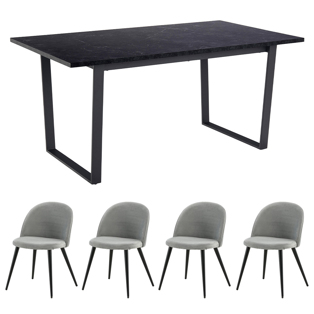 ebuy24 Tilst eethoek eettafel zwarte marmerprint 90x160 4 stoelen velours grijs.