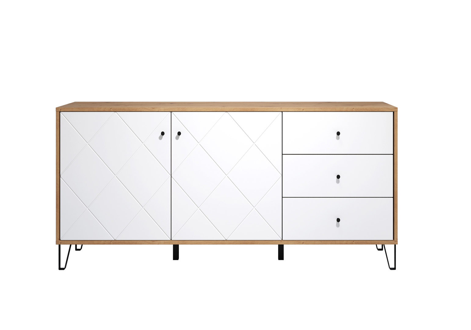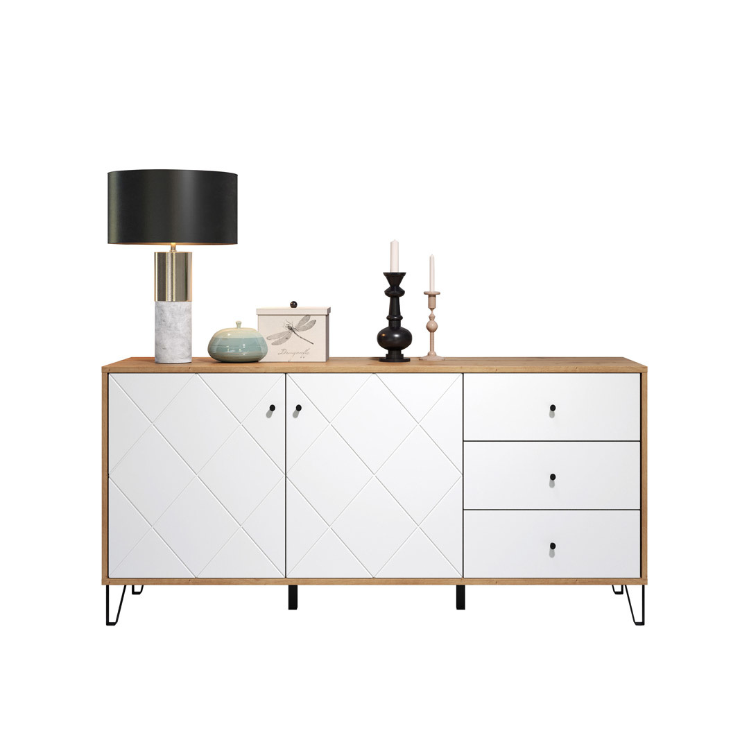 Touch dressoir 2 deuren, 3 laden eiken decor, wit mat.