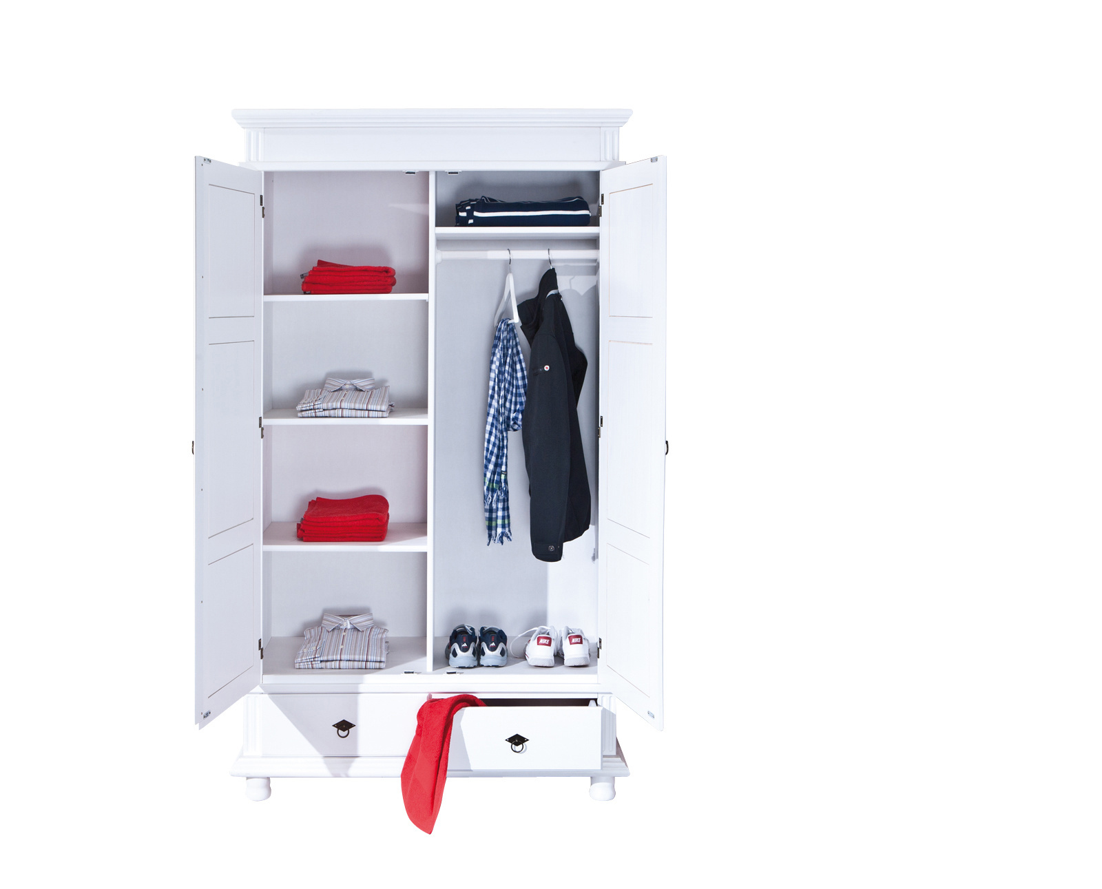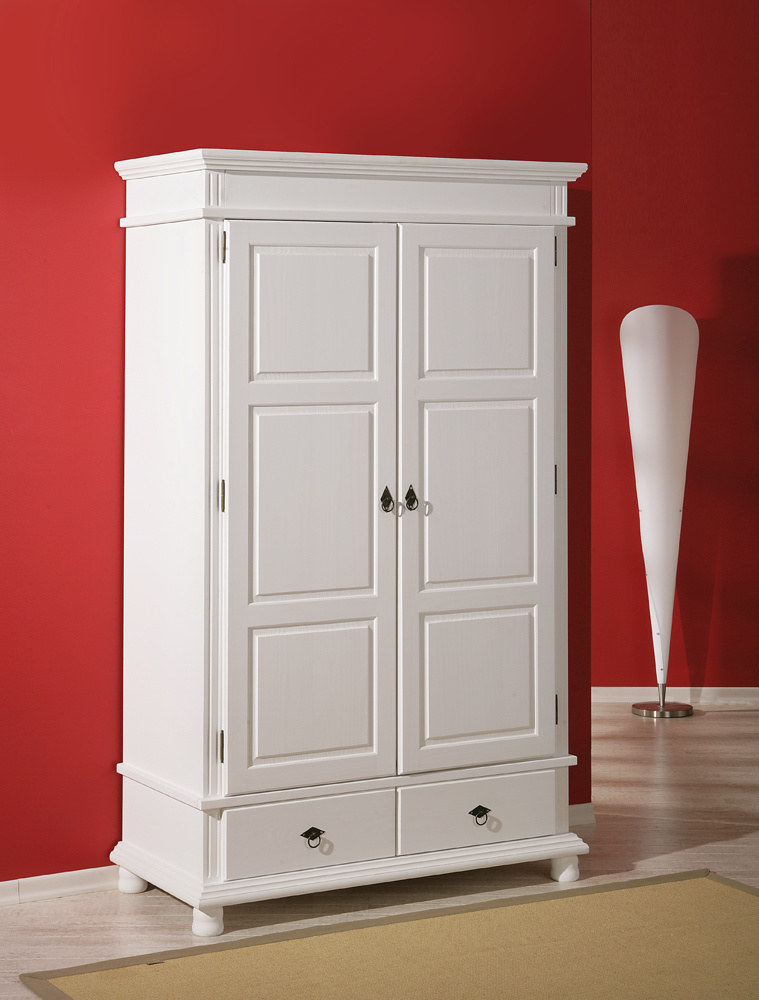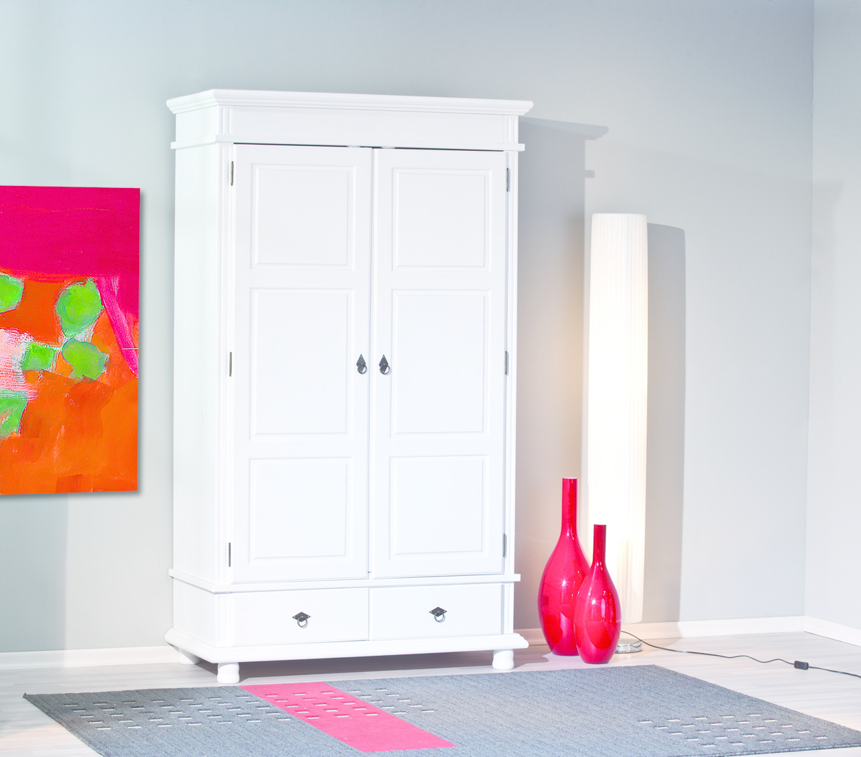 Massief wit grenen tweedeurskledingkast met 2 schuiflades. Een stabiele en stevige kledingkast voor in uw slaapkamer! De kledingkast Danz past zeer goed bij de wit gelakte tienerbedden uit ons assortiment. ...Lees uitgebreide product informatie
