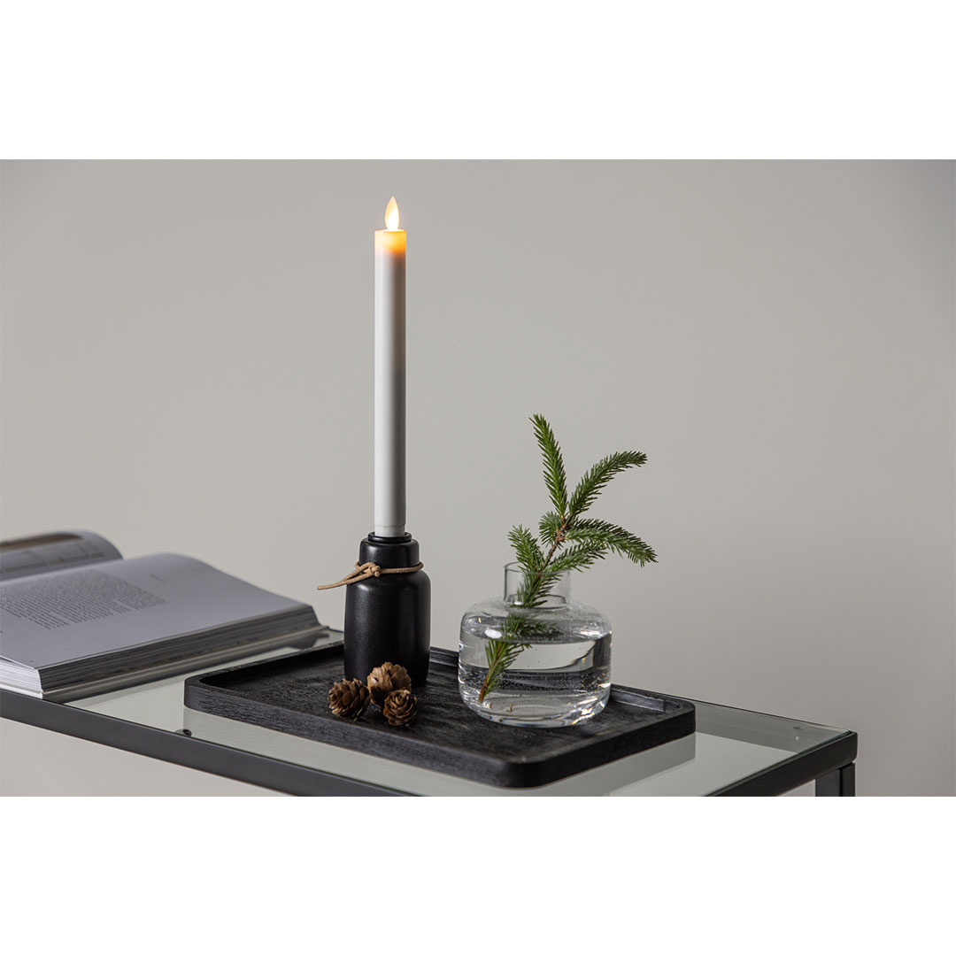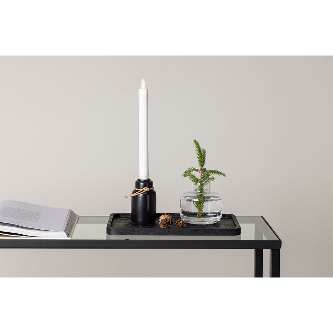 Ulricehamn kandelaar met LED-licht zwart is een decoratie en servies in zwarte kleur die zowel stijl als functionaliteit in uw huis brengt. Ulricehamn kandelaar met LED-licht zwart. Even slim als stijlvol: deze zwarte kandelaar met LED-lampjes uit de Ulricehamn-serie zal je beste vriend zijn tijdens de donkere helft van het jaar! Deze prachtige kandelaar combineert het beste van zowel klassiek als modern design en geeft je een decordetail dat overal bij past. Met zijn stijlvolle zwarte voet, bruin snoer en het prachtige witte kunststof LED-lampje dat het klassieke kroonlicht nabootst, is dit een uitstekend alternatief. Je hoeft je geen zorgen meer te maken over het in de gaten houden van de vlammen van de kaarsen, want dit is het veilige alternatief dat je ook nog eens een gezellige sfeer geeft met hetzelfde gevoel. Zorg dus voor sfeer met een slimme kaarsenhouder. Of je nu geniet van een gezellige avond op de bank of een etentje regelt voor vrienden, deze kandelaar zal op prachtige wijze de sfeer bepalen. Ulricehamn is verkrijgbaar in verschillende hoogtes, dus je kunt ze combineren of de hoogte kiezen die het beste bij je past! Afmetingen kandelaar: 7 cm. Totale hoogte: 28 cm. Dit product is gemaakt met oog voor detail, wat zowel esthetische aantrekkingskracht als hoge duurzaamheid garandeert. Het is ontworpen met zowel functionaliteit als stijl in gedachten, waardoor het de perfecte keuze is voor elke kamer in uw huis. De gebruikte materialen zijn van hoge kwaliteit, waardoor het product een lange levensduur heeft en bestand is tegen dagelijks gebruik. Of het nu voor opslag is of als decoratieve toevoeging, dit product zal uw interieur naar een hoger niveau tillen en extra comfort en elegantie in uw huis brengen.