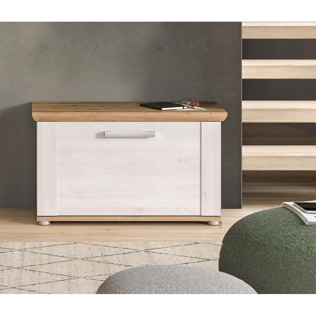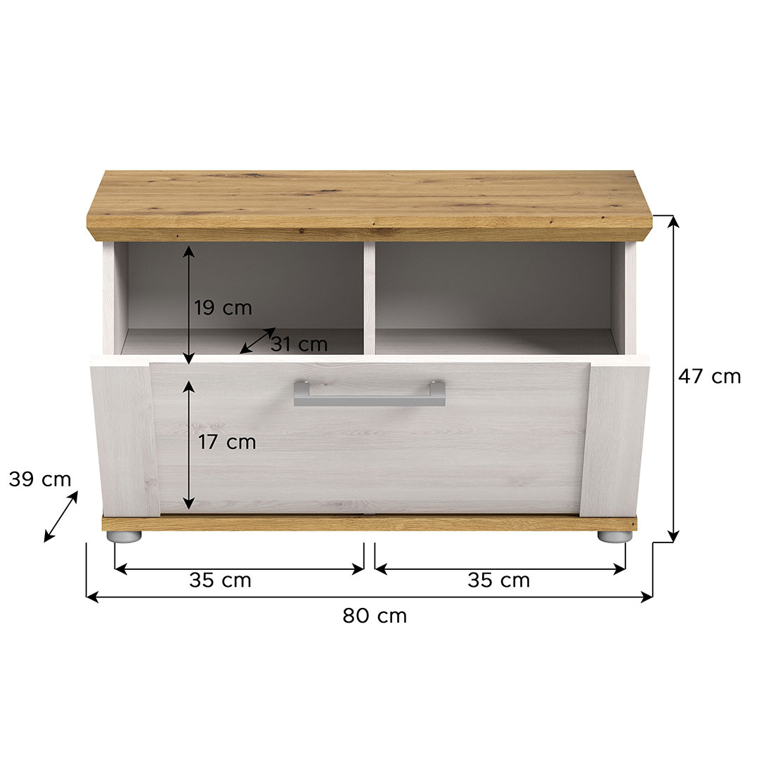 Verona bank 1 vouwdeur lariks decor. Losse planken: 2. Bank Verona in lariksdecor is een functionele en stijlvolle oplossing voor uw inkomhal, woon- of slaapkamer. Met zijn robuuste constructie en modern design dat een licht lariksdecor combineert met een natuurlijk houten blad, biedt deze bank zowel opbergruimte als zitgelegenheid. De praktische vouwdeur biedt gemakkelijke toegang tot opbergruimte, terwijl de twee losse planken gebruikt kunnen worden voor het opbergen van schoenen, opbergdozen of andere benodigdheden. De Verona bank is zowel een esthetische als functionele toevoeging aan uw huis.