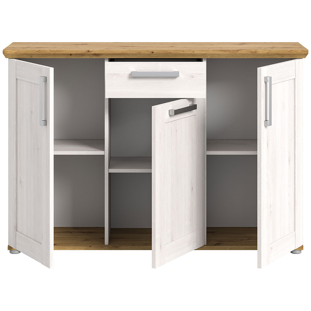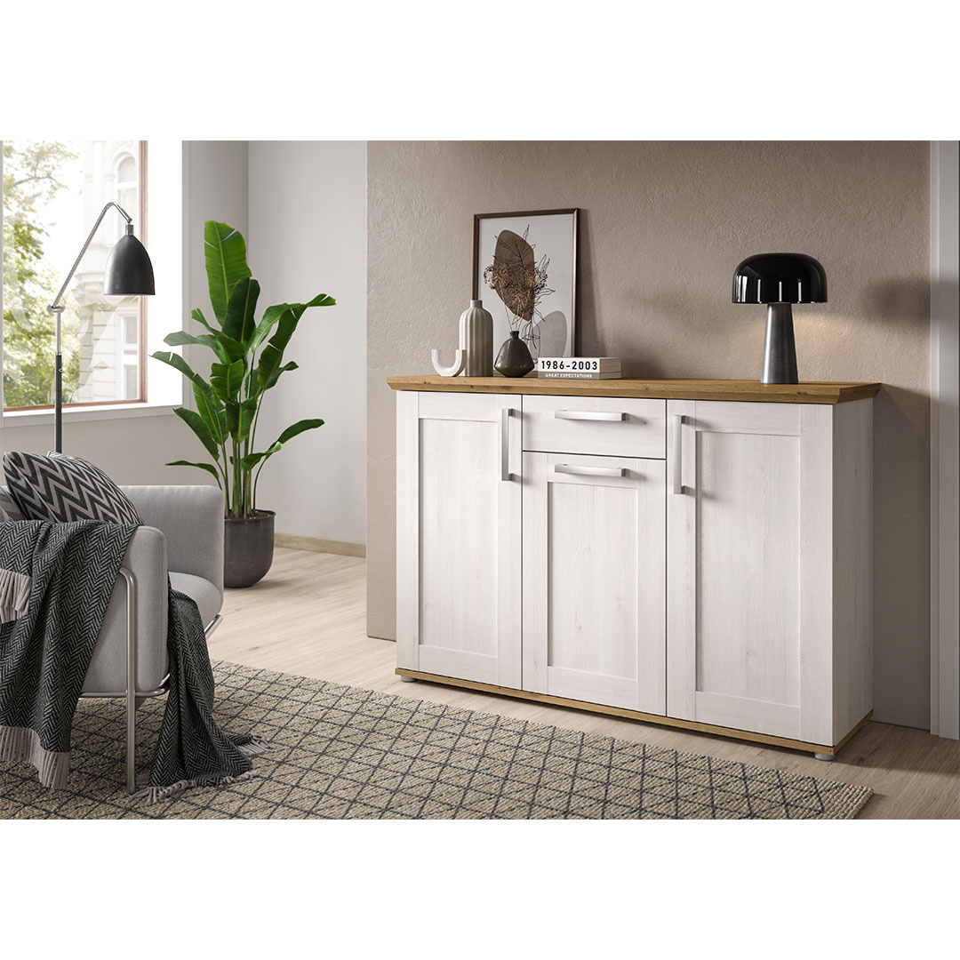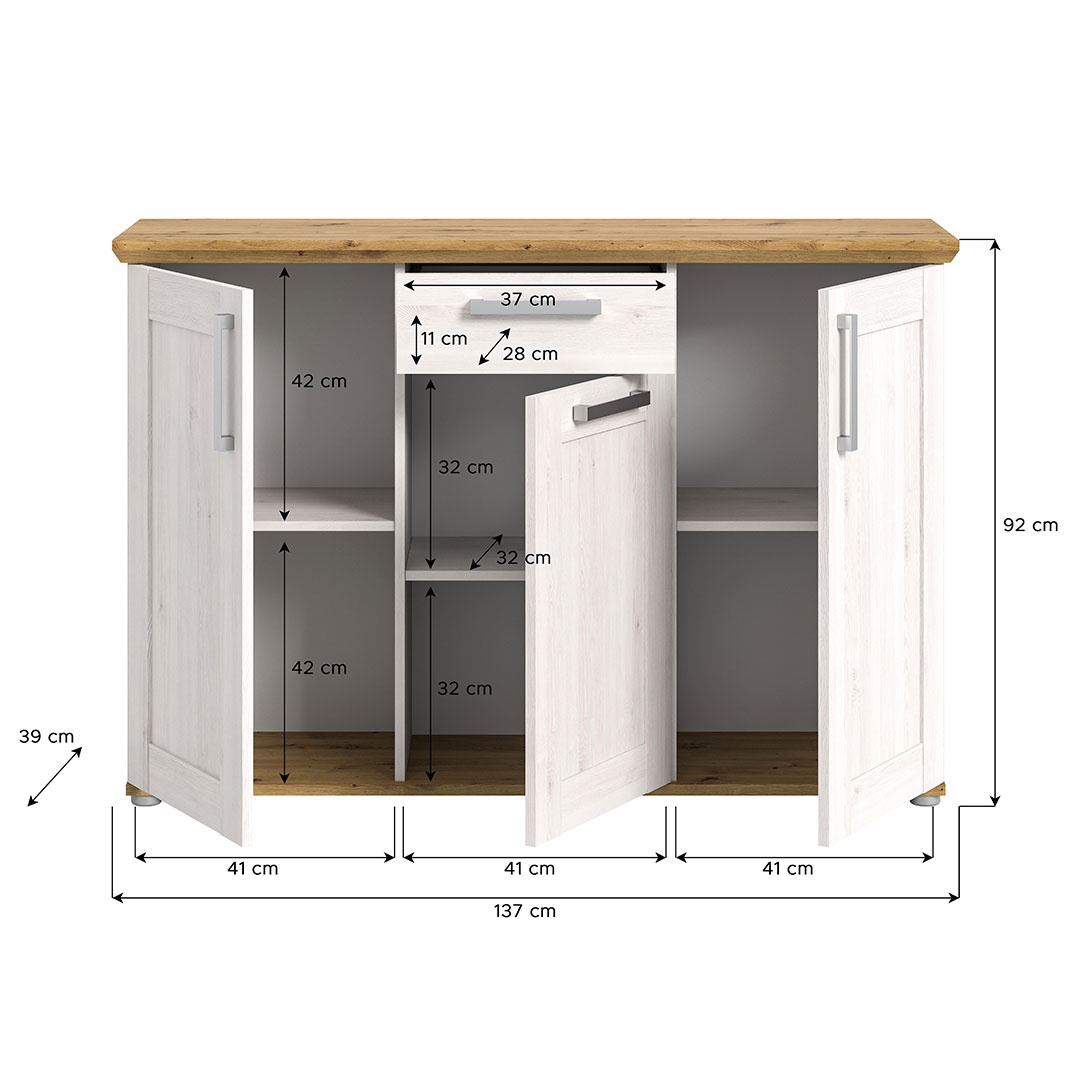 Verona dressoir 1 lade 3 deuren lariks decor. Deur kan rechts/links gedraaid worden. Losse planken: 3. Dressoir Verona in lariksdecor is een elegante en functionele oplossing voor opbergruimte in huis. Dit dressoir bestaat uit een lade en drie deuren, waarbij de deuren zowel naar rechts als naar links gedraaid kunnen worden voor een eenvoudige aanpassing aan jouw interieur. Het lichte lariksdecor gecombineerd met houtkleurige details aan het blad geeft een natuurlijke en moderne uitstraling. Het dressoir is ideaal voor het opbergen van kleding, serviesgoed of andere huishoudelijke spullen. Met drie verstelbare planken aan de binnenkant biedt het flexibele opbergruimte die kan worden aangepast aan uw behoeften.