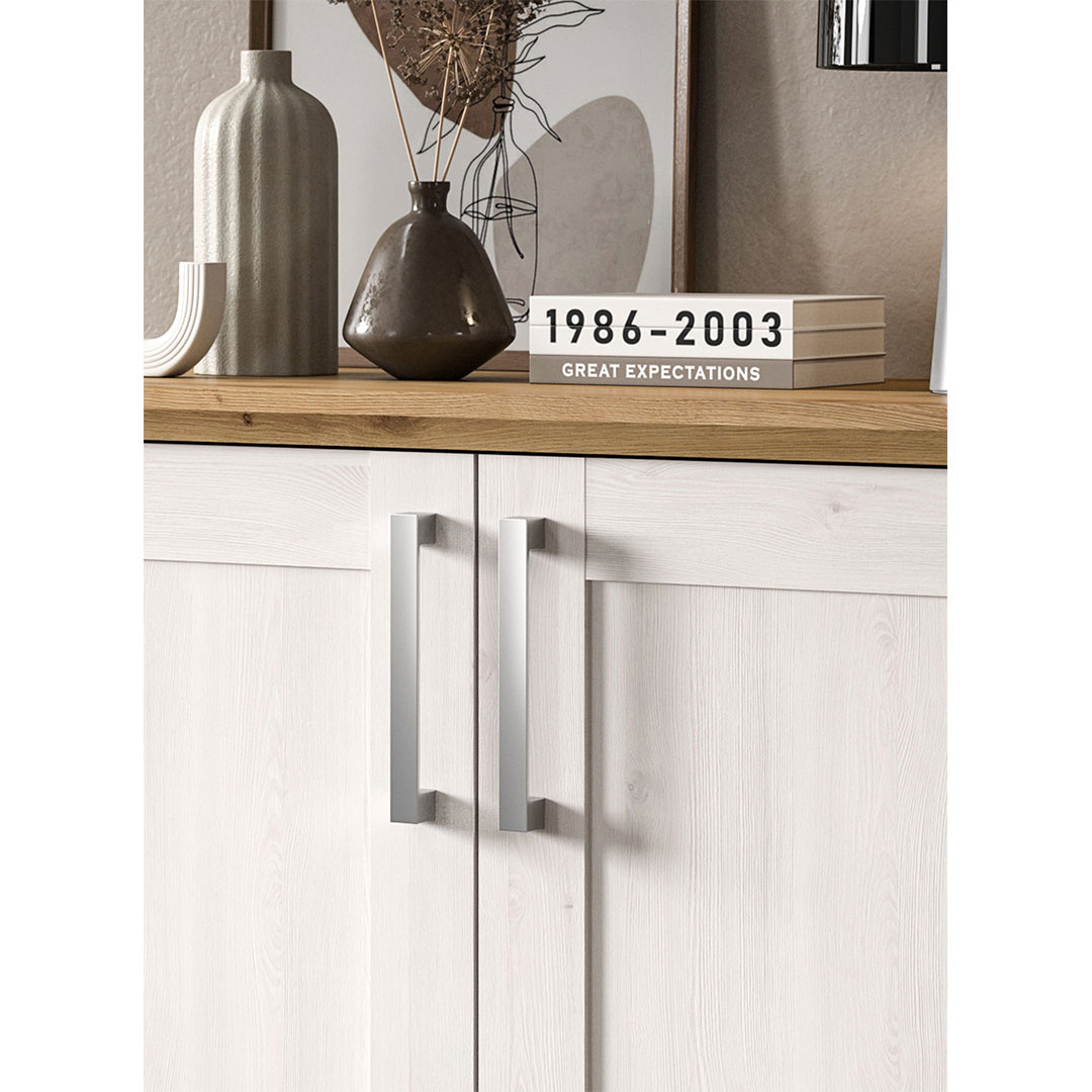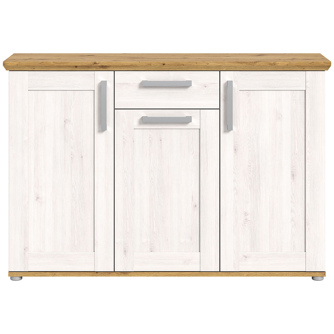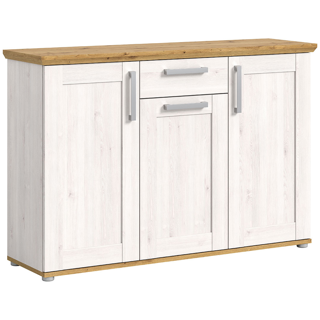 Verona dressoir 1 lade 3 deuren lariks decor. Deur kan rechts/links gedraaid worden. Losse planken: 3. Dressoir Verona in lariksdecor is een elegante en functionele oplossing voor opbergruimte in huis. Dit dressoir bestaat uit een lade en drie deuren, waarbij de deuren zowel naar rechts als naar links gedraaid kunnen worden voor een eenvoudige aanpassing aan jouw interieur. Het lichte lariksdecor gecombineerd met houtkleurige details aan het blad geeft een natuurlijke en moderne uitstraling. Het dressoir is ideaal voor het opbergen van kleding, serviesgoed of andere huishoudelijke spullen. Met drie verstelbare planken aan de binnenkant biedt het flexibele opbergruimte die kan worden aangepast aan uw behoeften.