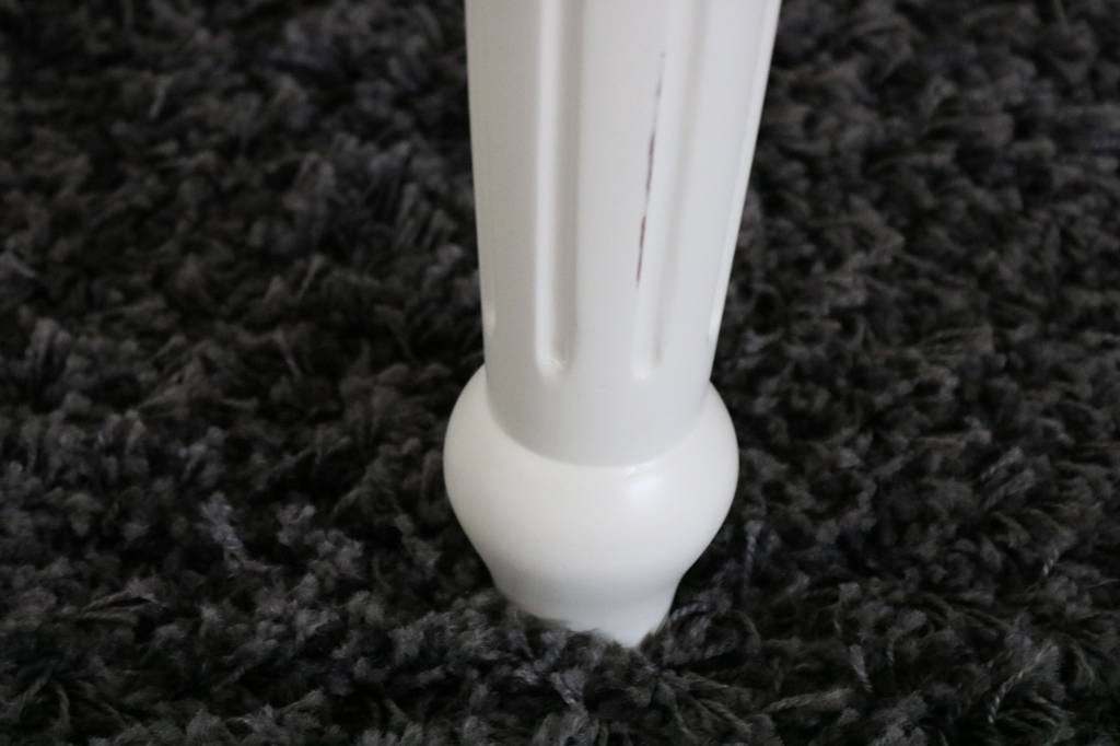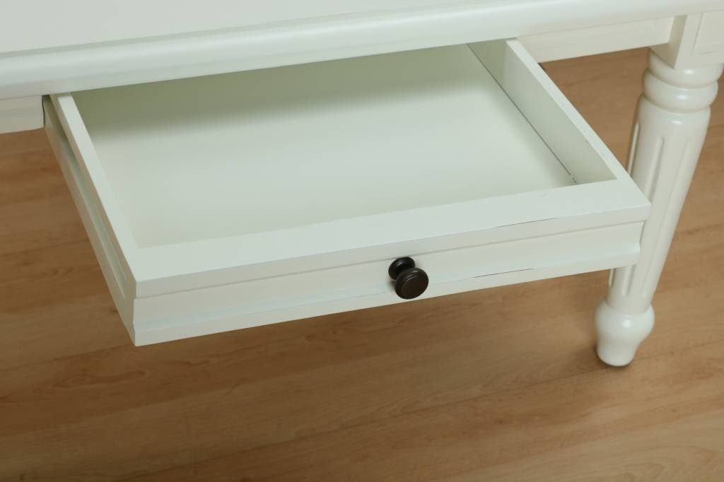 - Wit (off white), Massief hout. Houtfineer tafelblad. Antiek wit gelakt, antiek gepatineerd.