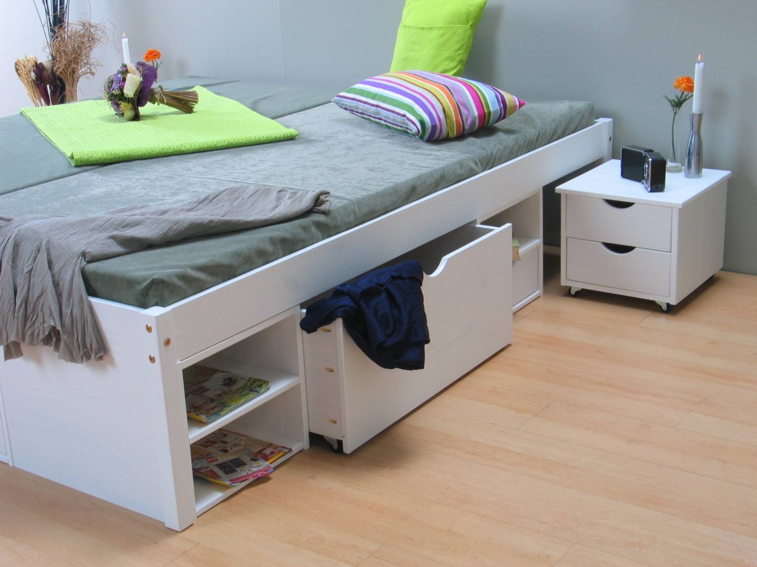 - Nachtkastje (B: 40cm / H: 35 cm / D: 40 cm) met twee laden, op wielen, kan onder het bed gerold worden